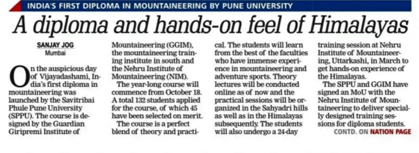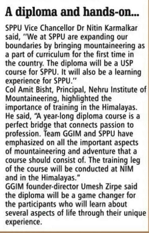 GGIM in association with Savitribai Phule Pune University, Pune & Nehru Institute of Mountaineering, Uttarkashi has launched Diploma Course in Mountaineering. For the first time in India, adventure education is being brought under academic curriculum inculcating the values derived through mountaineering life style.