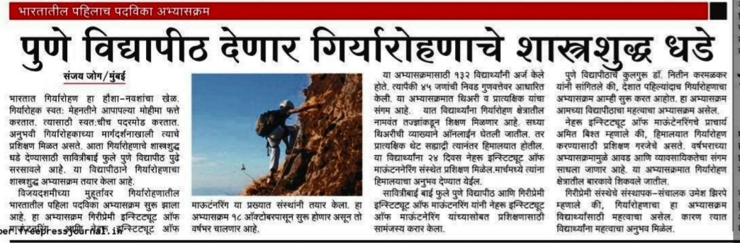 The course envisions to impart the skills of mountain climbing, sensitise trainees to respect mountains and their ecosystems, develop intrepid resilience and self confidence, gain experince of value based education, and those who are further passionate, can seek sustainable employability in the feld of adventure and mountaineering stream. Additionally, being associated with a reputed academic institution like Pune University, which offers 36 credits, makes this course a unique educational curricullum.